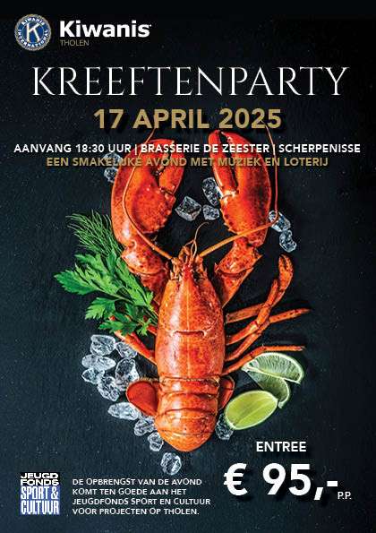 Op donderdag 17 april 2025 organiseert Kiwanisclub Tholen weer een Kreeftenparty.